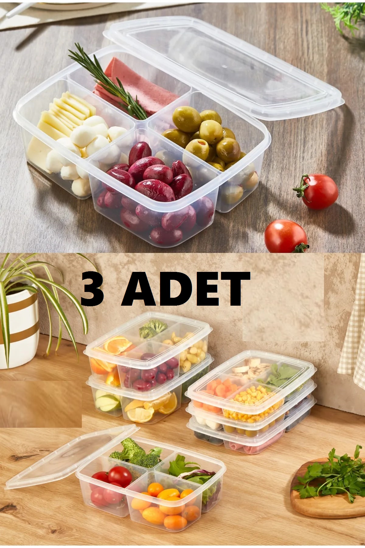 3 Adet 4 Bölmeli Diyet Saklama Kabı Öğünlük Kahvaltılık Piknik Beslenme Mikrodalga- Dipfriz uyumlu