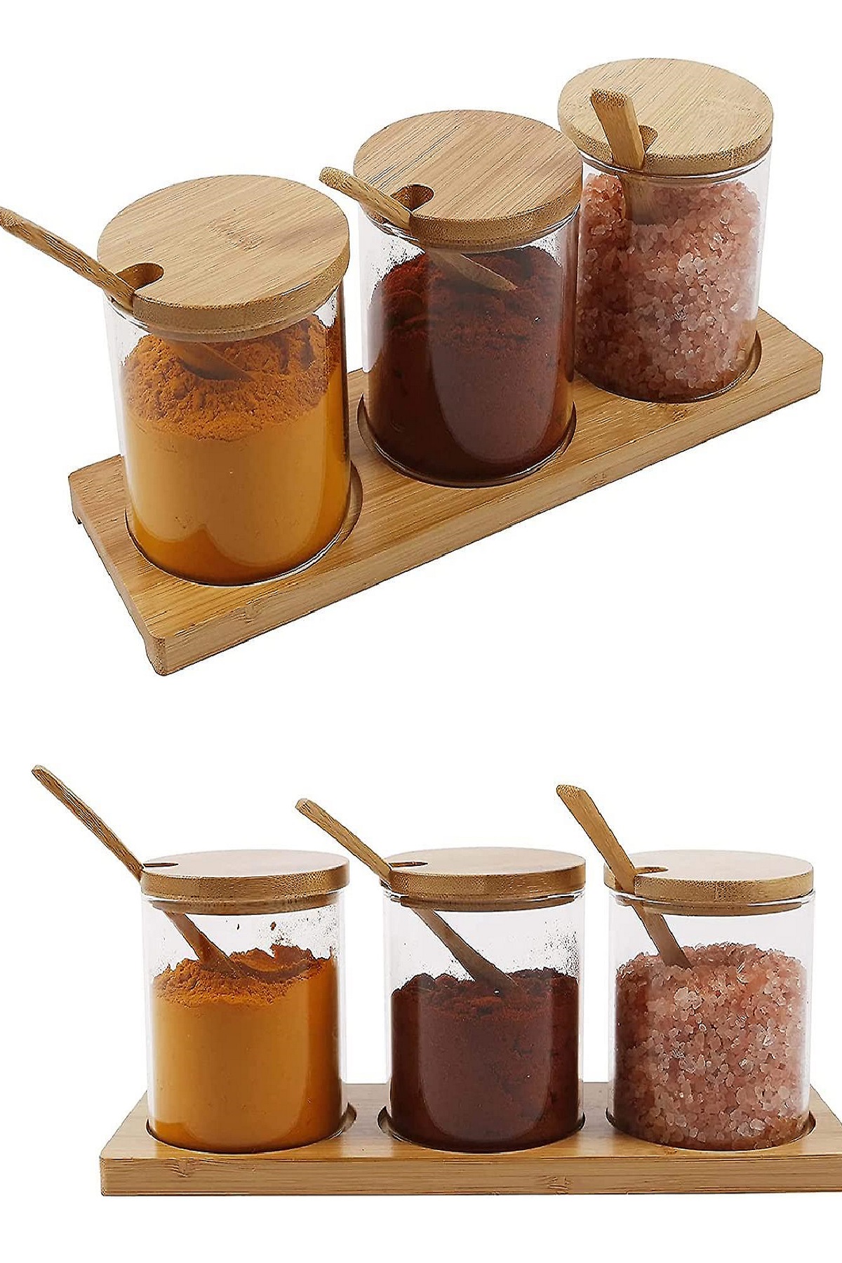 3 LÜ Stantlı Cam Kavanoz Baharatlık Seti – Kaşıklı Bambu Kapaklı Baharatlık