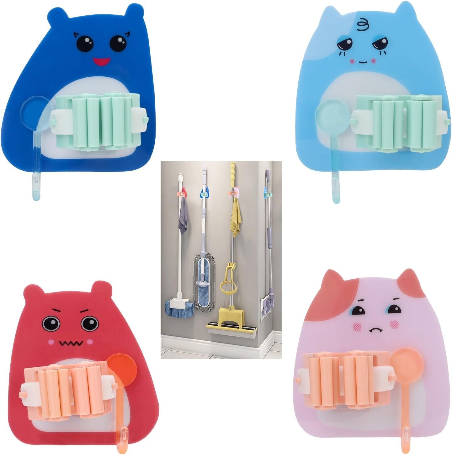 4 Adet Karikatür Figürlü Yapışkanlı Süpürge Mop Fırça Sap Tutucu Delmesiz Mutfak Banyo Askı