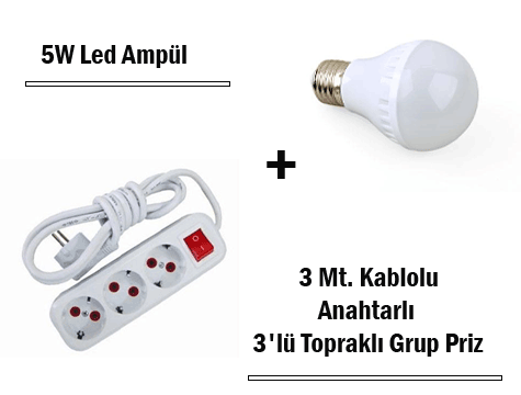5W Led Ampul + 3 Metre Uzatmalı Anahtarlı 3lü Priz Set