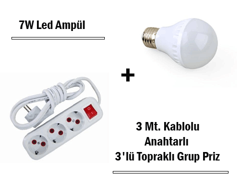 7W Led Ampul + 3 Metre Uzatmalı Anahtarlı 3lü Priz Set