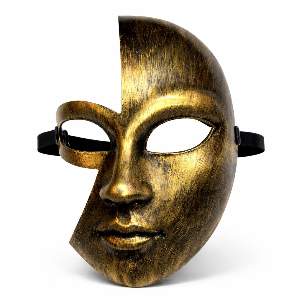 Antik efektli altın yarım yüz maskesi ile dikkat çekici ve karizmatik bir görünüm elde edin. Metalik gold yüzeyi ve özel eskitme dokusu sayesinde güçlü, gizemli ve sahneye yakışan bir stil sunar.