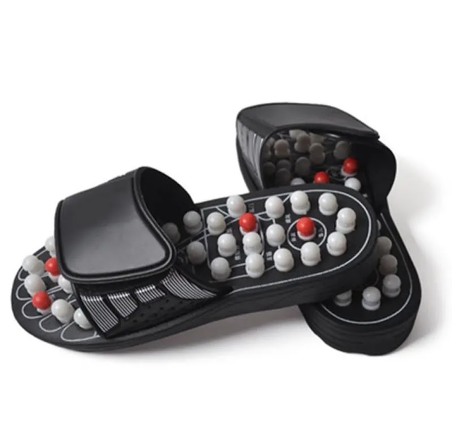 Bu terlik özellikle tabanlarında çok sayıda çıkıntılı düğme bulunan bir çift siyah masaj terliği dir. Bu terlikler, kullanıcıların yürüdükçe ayaklarına masaj yapmasını ve refleksoloji noktalarını uyarmasını amaçlayan bir tasarıma sahiptir. Beyaz ve dikkat çekici kırmızı renklerdeki yuvarlak düğmeler, ayaktaki belirli basınç noktalarına odaklanarak kan dolaşımını artırmaya yardımcı olur ve rahatlamaya yardımcı olmayı hedefleyen bir cihazdır.