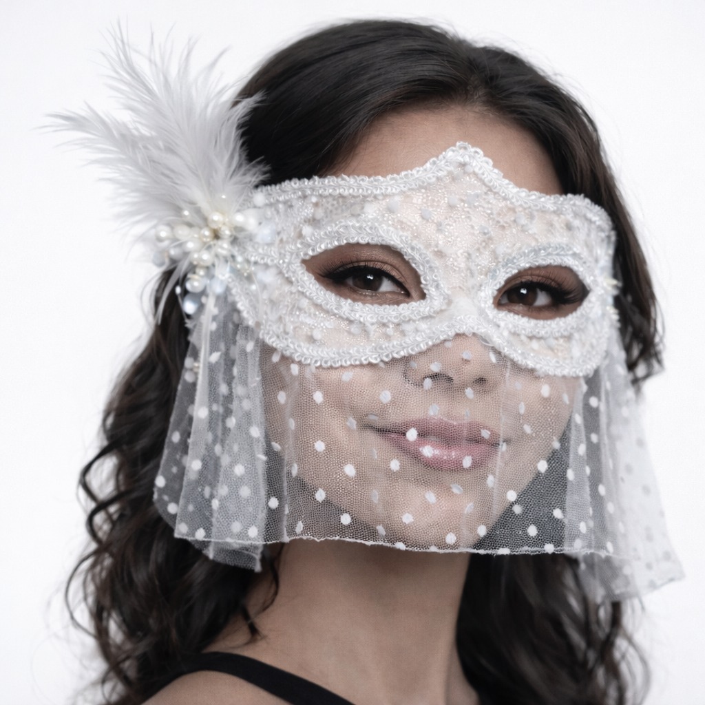 Zarafet ve romantik bir görünüm arayanlar için tasarlanan Beyaz Dantel Tüllü Peçeli Parti Maskesi, şıklığı ve detaylarıyla öne çıkar.