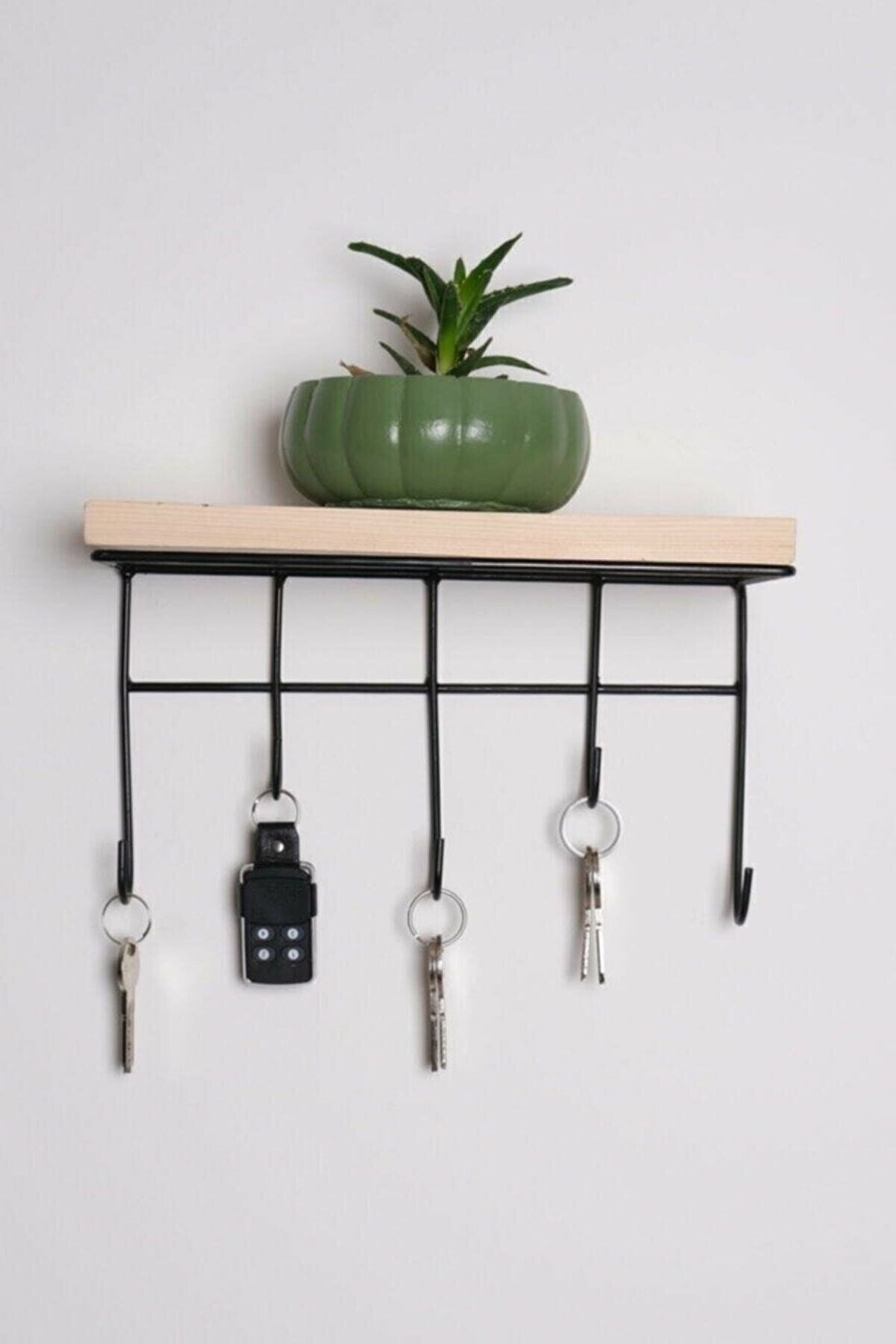 Dekoratif İskandinav Raf - 5 Kancalı Askılı Ahşap Raf Siyah