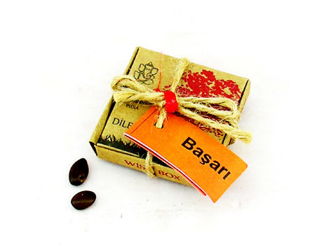 Ürün, özel kraft kutusu içerisinde olup, üzeri iple bağlıdır. Kutu ölçüsü: 4 x 4 cm.dir.