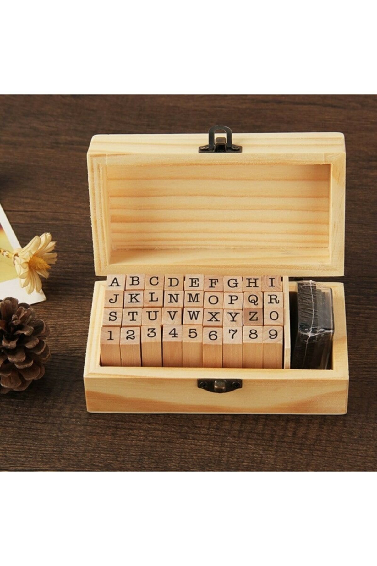 Damga seti 26 adet harf , 10 adet rakam , 1 adet mürekkep süngeri ve ahşap kutusuyla birlikte toplam 38 parçadan oluşmaktadır.