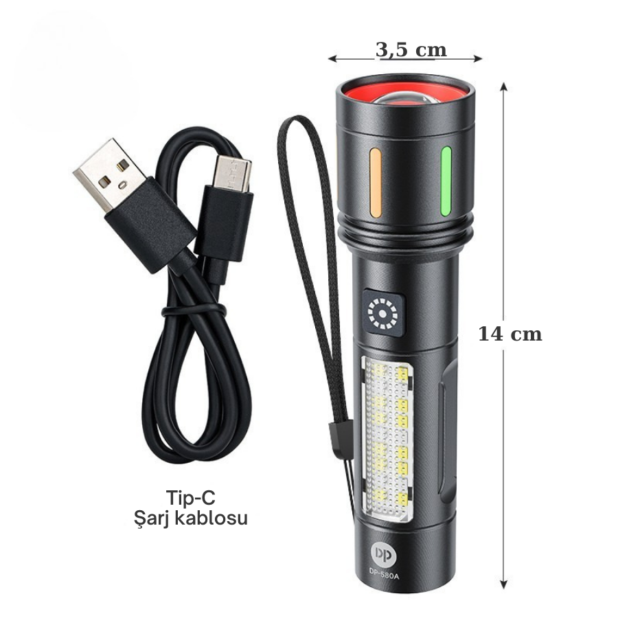 Gold Police GP-212 Şarjlı Metal El Feneri, 1000 lümen ışık gücüyle uzun menzil ve geniş açı aydınlatma sağlar. 5 farklı mod ile (güçlü, kısık, flaşör, beyaz COB, mavi-kırmızı çakar) her ihtiyaca uygundur. ZOOM özelliği sayesinde uzak mesafeleri net şekilde aydınlatır. Type-C şarjlı, su geçirmez ve dayanıklı metal gövdeli tasarımıyla profesyonel kullanım için idealdir.