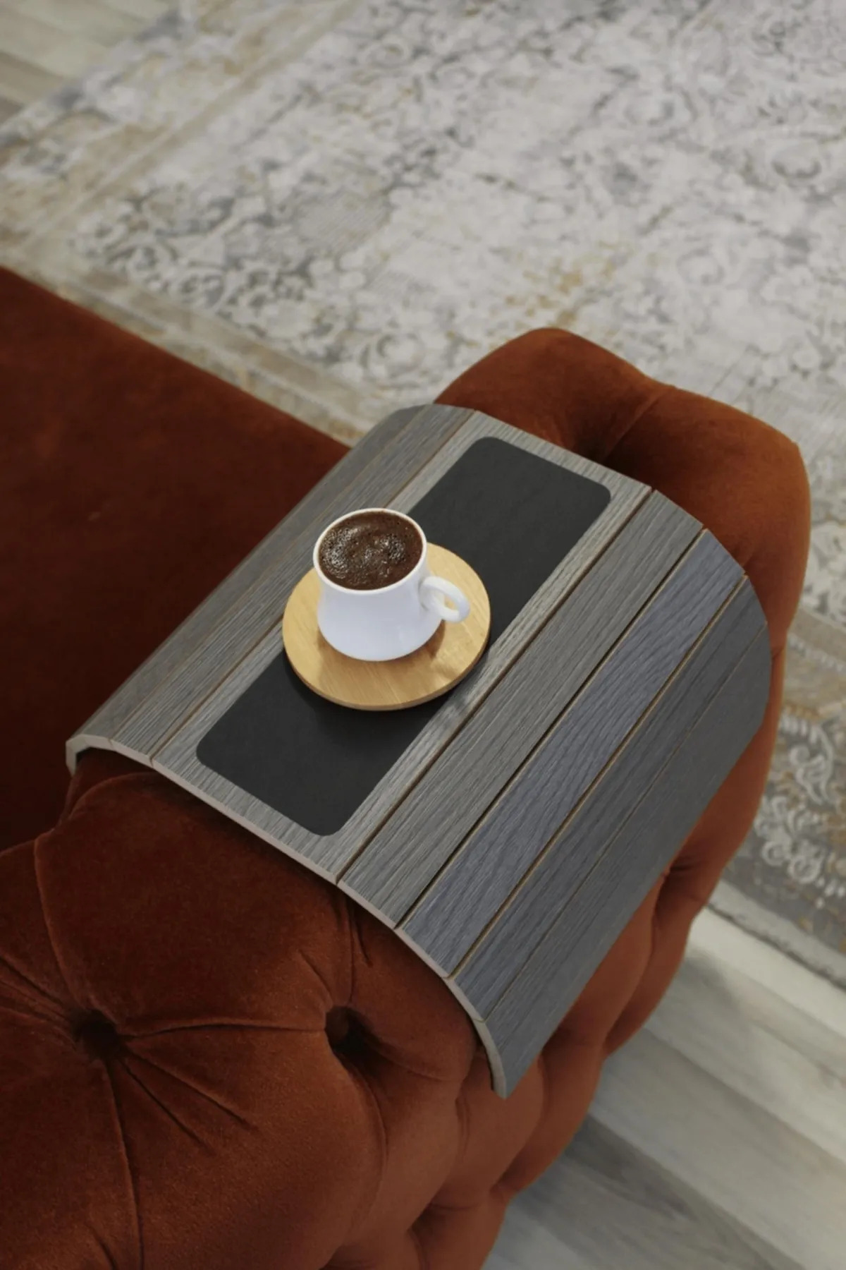 Deri tabanıyla yumuşak dokunuşlar sunarken aynı zamanda kaydırmaz özelliğiyle istediğiniz yapıda bardak ve araç gereci konumlandırabilirsiniz.