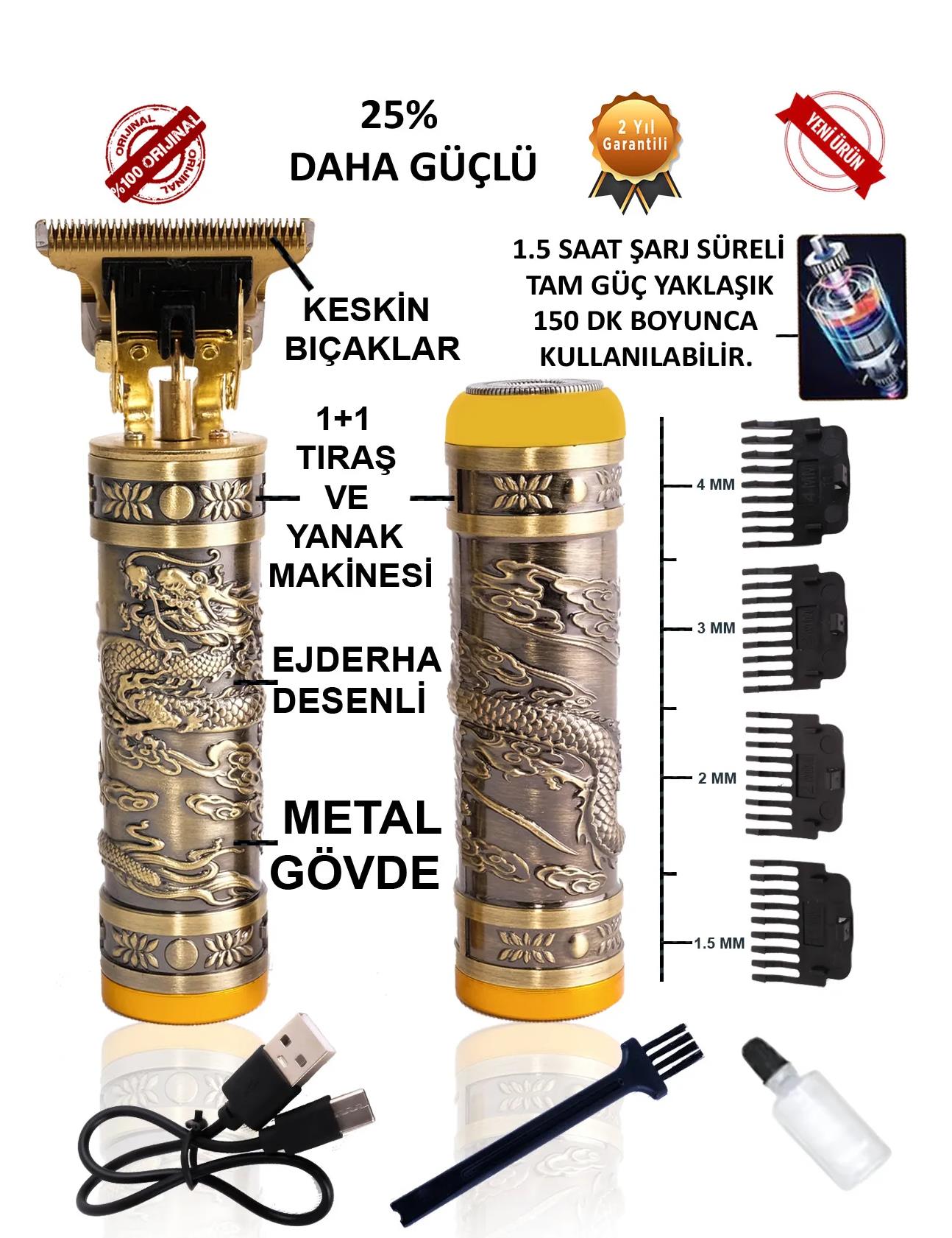 Şarjlı Kullanım Şarj edilerek kullanılan bu yanak ense tıraş makinesini isterseniz kablo ile isterseniz de şarj ederek kullanabileceksiniz. 1,5 saat gibi kısa bir sürede şarj olan yanak ense tıraş makinesi şarj olduktan sonra 150 dakika boyunca kesintisiz olarak kullanılabilecektir. Bu kablosuz kullanma imkânı sayesinde çok kolay ve özgür şekilde kullanabilirsiniz. Keskin Bıçaklar Keskin ve paslanmaz bıçakları sayesinde dakikalar içerisinde ve olabildiğince kolay şekilde tıraşınızı olabileceksiniz. En sert kılları bile keskin bıçaklar sayesinde kesebilirsiniz. Kesiciliğinin yanında cildinize çok sürtünmediği için akıcı bir tıraş deneyimi sunacaktır. Rahat Kavrama Bluemax marka yanak ense tıraş makinasının sapı elinize uygun olarak tasarlandığı için size rahat ve kolay bir tıraş deneyimi sağlayacaktır. 4 Farklı Tarak İmkanı 4 adet tarağa sahip olan bu ürünün istediğiniz gibi kullanabileceksiniz. İstediğiniz tarağı takarak farklı kesimler sağlayabileceksiniz. Mükemmel Görünüm Altın renginde olan bu ürün sonra derece şık ve özenli şekilde tasarlanmıştır. Makinenin yüzeyinde bulunan çeşitli ejderha deseni motifler ona son derece farklı bir görünüm sunmaktadır.