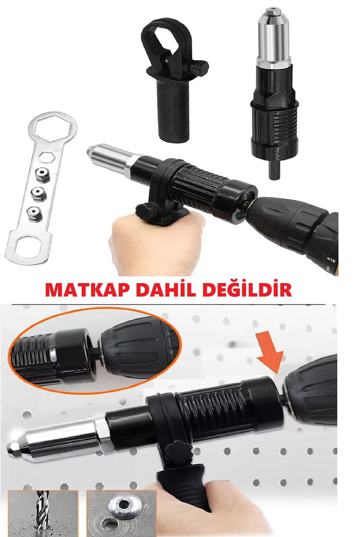 Perçin tabancası adaptörü Tüm bir birim olarak monte kitte perçinler sabitlemek için alaşımlı çelik dövme perçinleme tabancası, esnek rotor ve 4 farklı eşleşen cıvata içerir. Verimli, güçlü ve hızlı. Yüksek stabilite sağlayan ekstra kaymaz sıkma fikstürünü ile birlikte gelir.