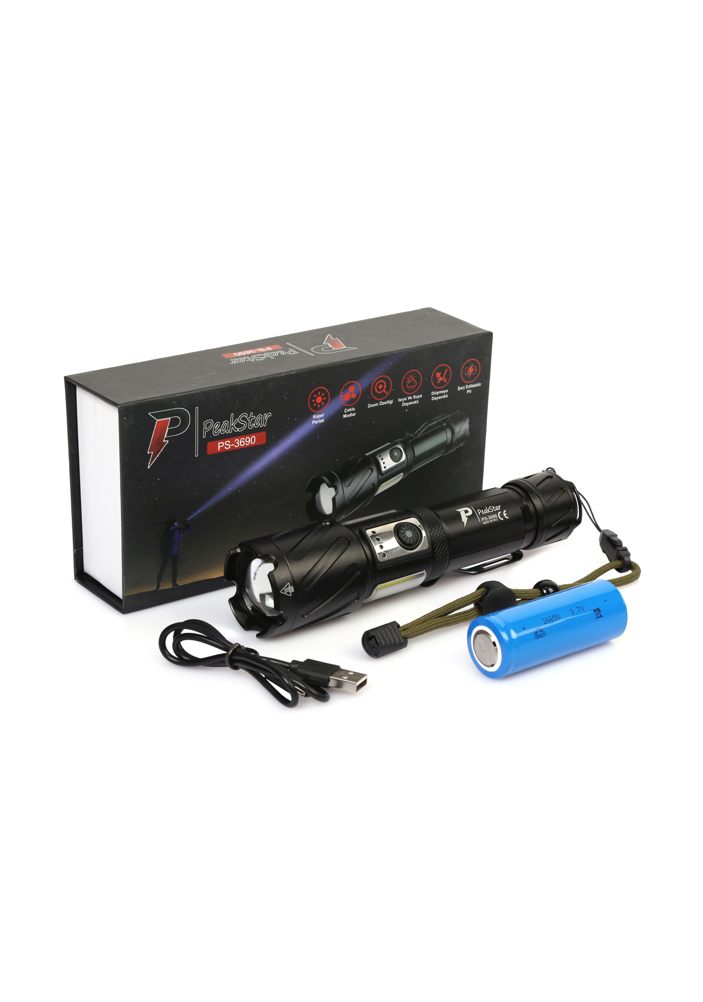 • Marka: PeakStar Model: 3690 LED: XHP99+ COB Ölçüleri: 17.5*4.3*3CM Net Ağırlık: 228G Malzeme: Alüminyum Düğme: Tek Düğme Batarya: 1*18650/1*26650/3*AAA Işık Modu: 6 Mod: Güçlü Işık-Zayıf Işık- Çakar Mod- COB Sarı Işık- COB Beyaz Işık- COB Kırmızı Flash Şarj Yöntemi: Type-C USB Şarj Zoom: Telescopic Zoom