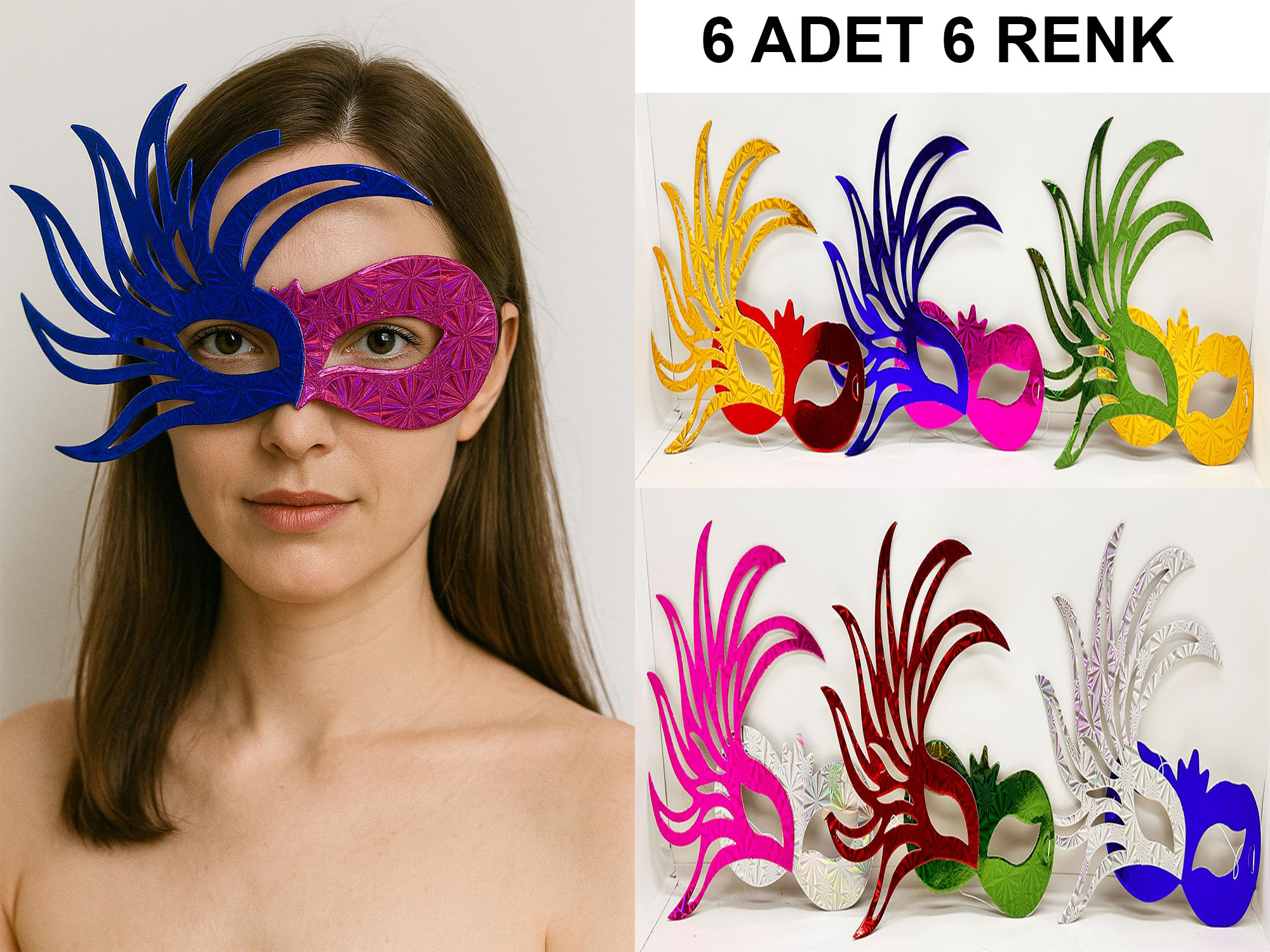 Set içerisinde 6 farklı renkte ve özgün formda tasarlanmış maske bulunur. Doğum günü kutlamaları, karnavallar, kostüm partileri, yılbaşı eğlenceleri, okul gösterileri ve fotoğraf çekimleri gibi etkinlikler için mükemmel bir aksesuardır.