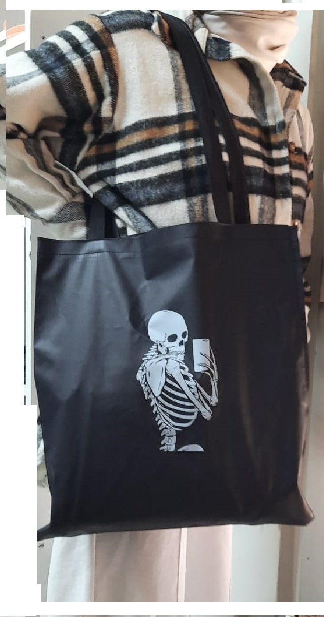 Selfie Çeken İskelet Bez Çanta - Pazar Market Çantası - Kitap Çantası Siyah
