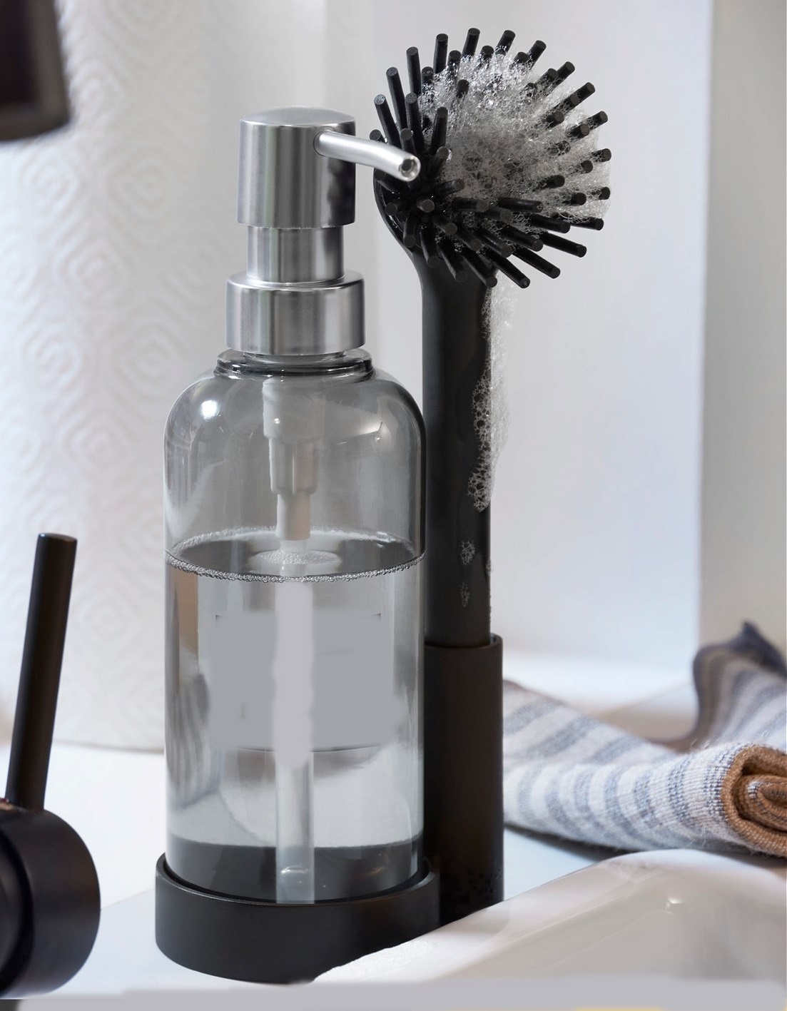 Silikon Fırçalı Sıvı Sabunluk Deterjanlık - Stantlı Mutfak -Banyo Temizlik Seti