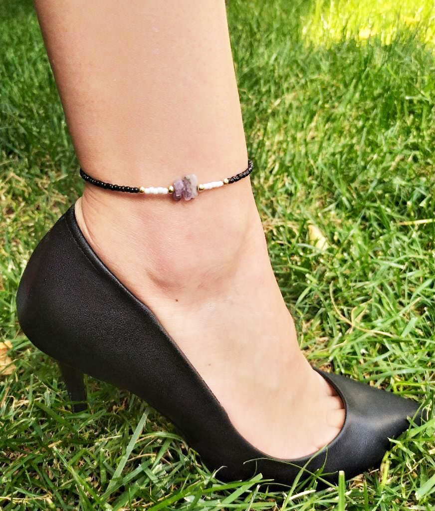 1 Adet Siyah Beyaz Boncuklu Halhal Kırık Ametist Doğal Taşlı Ayak Bilekliği