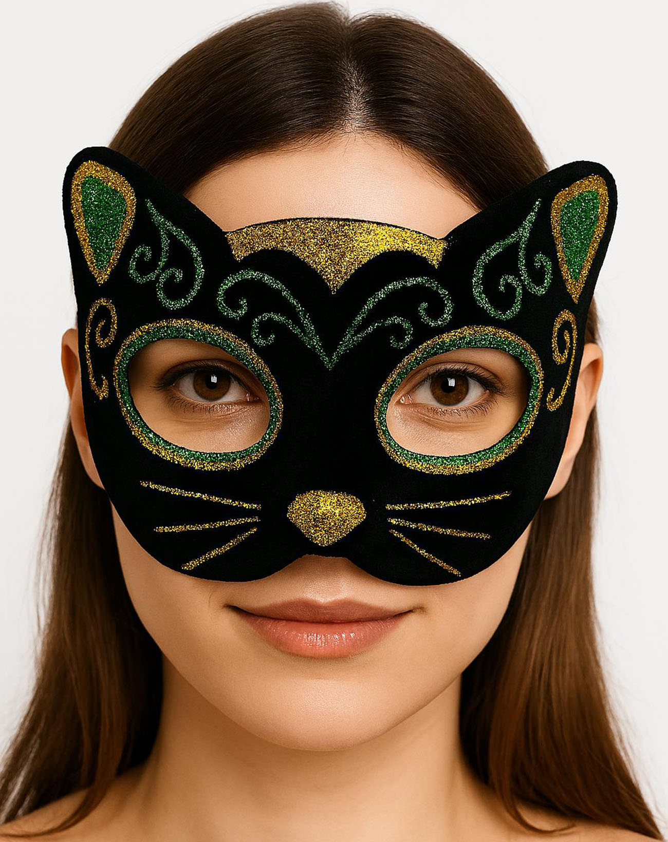 Siyah Kadife Kaplama Üzeri Sarı Yeşil Sim İşlemeli Kedi Maskesi, balolar, maskeli partiler veya kostüm partileri gibi eğlenceli etkinliklerde sevimli ve dikkat çekici bir kedi görünümü elde etmek isteyenler için mükemmel bir seçimdir. Yumuşak siyah kadife kaplaması, parlak sarı yeşil sim işlemesi ve sevimli kedi kulakları ile bu maske sizi partinin en eğlenceli ve sevimli konuğu yapacak.