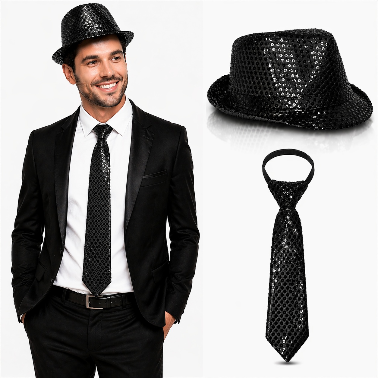 Partilerin en dikkat çekici kombini olmaya hazır olun! Siyah Payetli Şapka ve Kravat Seti, ışıltılı ve göz alıcı tasarımıyla eğlence, sahne ve özel günlerde tarzınızı bir adım öne çıkarır. Parlak payet kaplaması sayesinde ışık altında harika bir görünüm sunar ve bulunduğunuz ortamda tüm dikkatleri üzerinize toplamanızı sağlar.