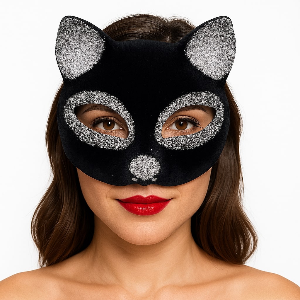 - Siyah süet ve gümüş simlerle süslenmiş sevimli bir kedi maskesi tasarımı.