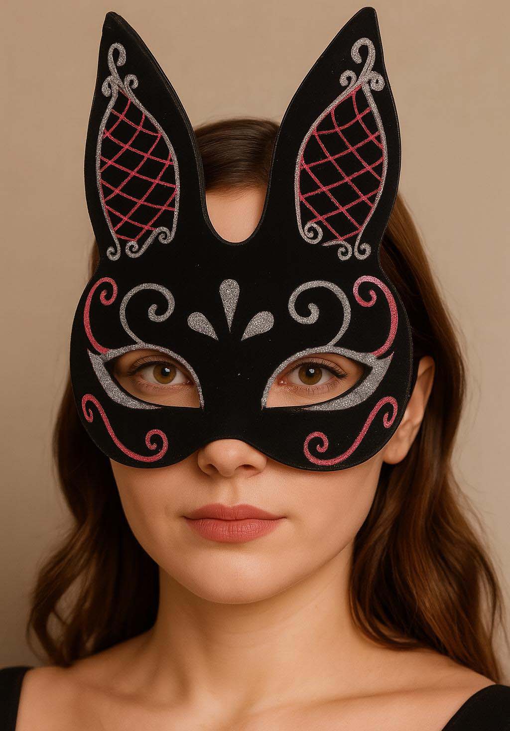 Bu siyah süet kaplama tavşan maskesi, kırmızı ve beyaz simlerle süslenmiş göz alıcı bir tasarıma sahiptir. 18x16 cm boyutlarındadır ve çoğu yetişkine uygundur.
