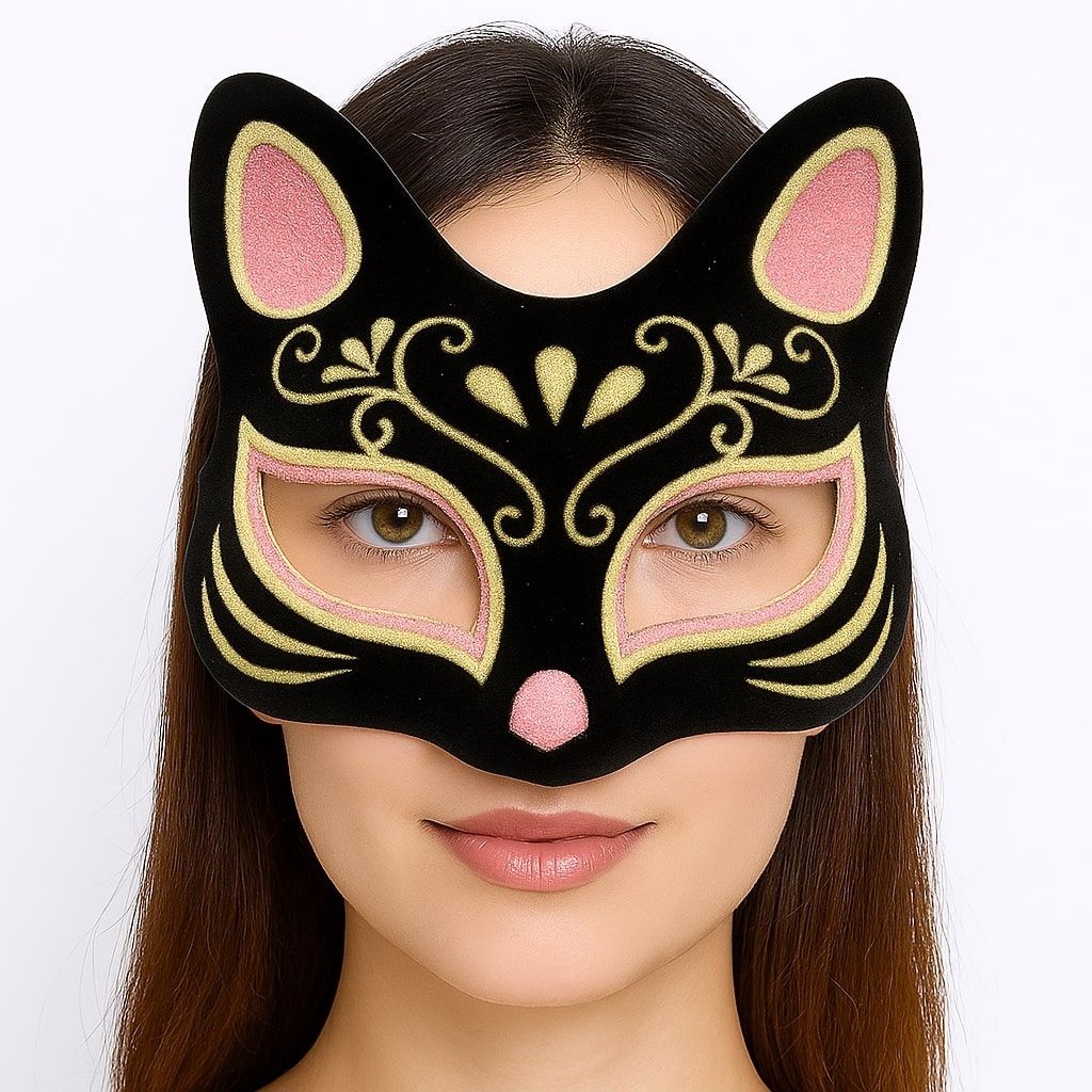 Siyah Renk Üzeri Pembe Sarı Simli Süet Kaplama Kedi Maskesi ile gizemli ve etkileyici bir görünüm oluşturun ve Kostüm Partisine hazır olun!